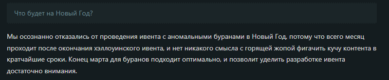 Второе - баланс ОТС делали сразу под новый заражения, об этом писать ещё в самом начало. Поэтому “третий уровень заражения у костюмимя” ни о чём не говорить - уровней будет пять, и как защита от них будет делаться - неизвестно. Основа задумки - не дать боевой броне силу ходить на Север, чтоб игроки делали и другая броня, или сборки за много денег на защиту, чувствуя себя инвалид.