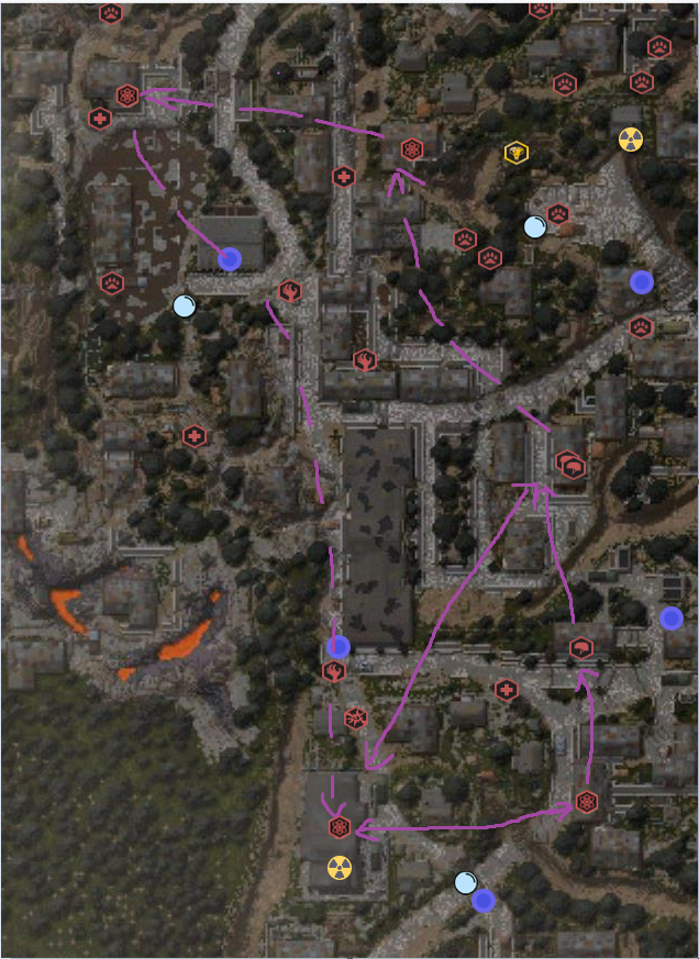 (пунктиром обозначен дополнительный более опасный маршрут, если ты сильный)