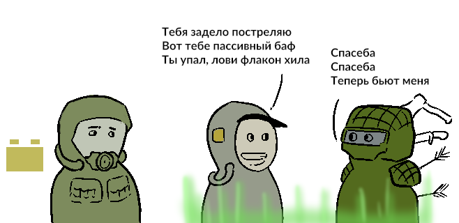 Почти всегда, в 9 из 10 случаев, когда вы приходите на точку и спавнятся враги - один из первых, кто придет к вам будет, извините за данный эпитет, ахуевший в край медик, который как законченный заправский герой неудержимых попытается захуярить вас проспамом с пистолета. Это просто нечто. Я не помню ни разу, чтобы этот доходяга в катке кого - то из мобов поднял, или ощутимо бустанул - но зато каждый раз наблюдал этого индивида перед собой, когда он пытался меня ( танка ) вжать в ноль с пистолета. И самое смешное урона ему не пожалели. При этом здоровья у него - не так уж и много.