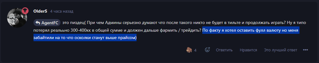 Мне нравится, что одна из причин вашего негодования это то, что вас “забайтили на то что осколки станут выше прайсом”, т.е. вам дали ложную информацию, вы вложились в это и прогорели.