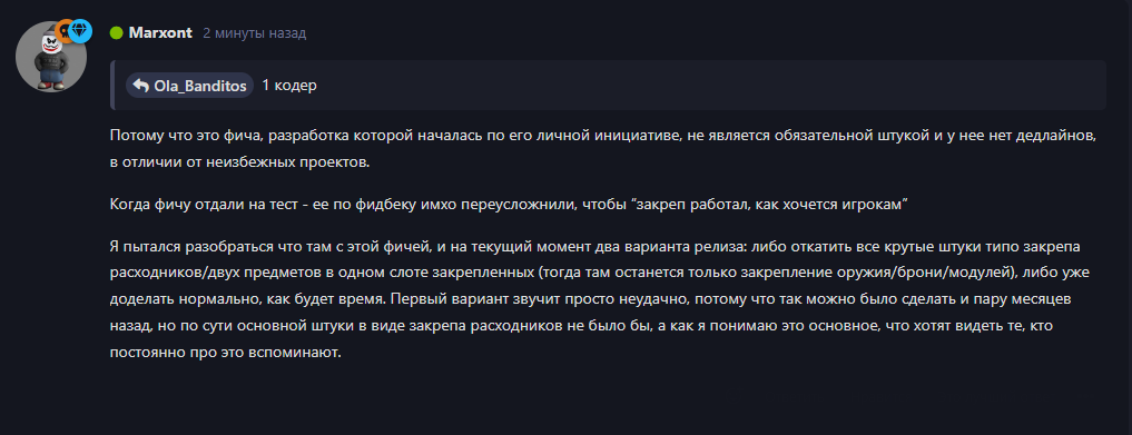 myskat_56 Я хочу предложить фичу в инвентаре для добавления в “избранное”. Нажал на предмете комбинацию(например alt+lmb) и предмет останется в том месте где оставил. Удобно с аном. установками и бустами
