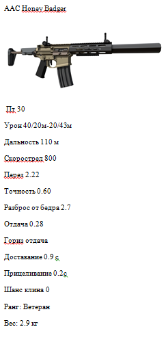 Хотелось бы чтобы в игре появилось новое оружие в виде AAC Honey Badger. Плюсы этого оружия в том, что у него интегральный глушитель, 800 скорострельности, первый момент падение урона и малый вес. По сути это ППшка в виде Штурмовой винтовки и является хорошей вторичкой к снайперке. Оружие это можно будет сделать у Спота из 3 чертежей, м4а1 и 30к. Чертежи будут в локациях от армов и далее. Оружие будет уровня ветеран. По модулям к этому оружию можно поставить все модули для нато оружия, кроме магазина на 100пт. При прокачке будет меняться урон, дальность, скорострельность и разброс. Надеюсь разработчикам понравиться это оружие и они добавят его.🦊