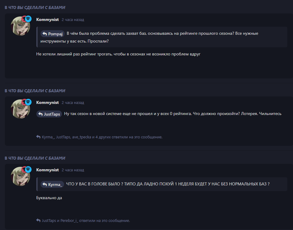 Бармен В каком смысле “Нет ничего такого”, причина такого имеется? Почему даже логически на базы не залетели S-A тир кланы? Почему так вышло ? Почему не будет компенсации за подобное, челы буквально за ничего схавали по 28к гильз, кто-то меньше, кто-то больше? Для чего вообще было давать возможность зарегаться на Базы, если залетели разные Лоу-Тир ГП, которые победили бы дай Бог Б1 тир команды? Я при всём желании не вижу большего интереса, кроме Баз на данной неделе КВ, фулл афк турниры, фулл афк потасовки, для чего я ожидал ?