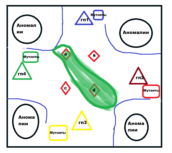 У каждой гп есть доступ к одному полю мутантов и одному полю аномалий, стартует гп с каким-то условным счетом казны(надо подумать каким чтоб не обкакаться в балансировке), в процессе захвата надо будет фармить казну непосредственно во время боя через поля аномалий и мутантов, иначе невозможно будет закупаться.